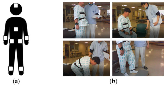 Eight IMUs are used in the experiment and worn on the forehead, left and right wrists, left and right upper hips, back of the left and right ankles, and back. Each IMU recorded the values of accelerometer X, Y, Z, roll, pitch, yaw, rotation X, Y, Z at a sampling rate of 100 Hz. The rotation refers to the number of rotations and is calculated by cumulatively aggregating the rotation angles of the sensor. Figure 3 depicts a photograph of the BBS experimental environment and the IMU attachment locations.
