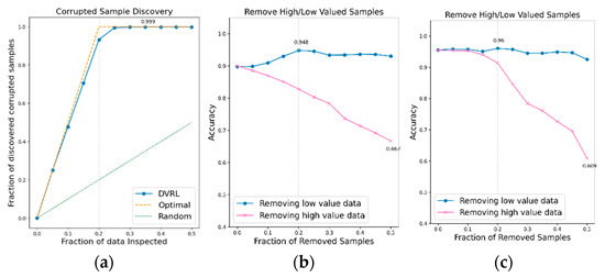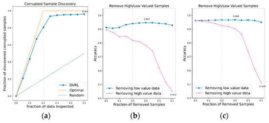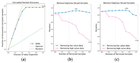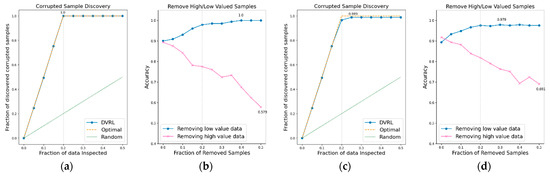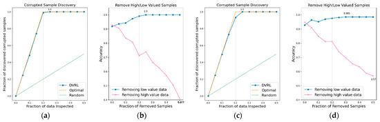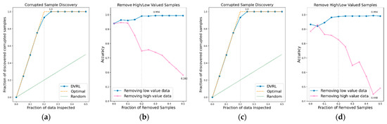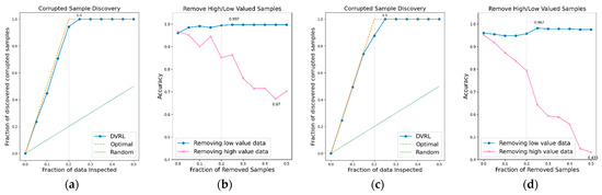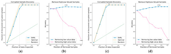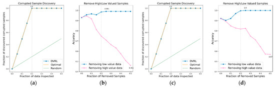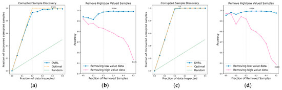 Corrupted sample discovery (CSD) and remove high/low-value samples (RHLVS) are used to evaluate the data valuation algorithm. In total, 20% of the labels of the training data are contaminated for evaluation. CSD represents the rate at which corrupted samples are discovered while accumulating a constant rate of the amount of data from the lowest value data. The performance of the data valuation algorithm can be considered to be excellent when several corrupted samples are observed in the low-value data. In the previous studies on data valuation algorithms [26,30], CSD was used as a performance evaluation criterion. A value is assigned to each sample of the training dataset using the trained data valuation algorithm, and the dataset is in descending order in terms of the value of . The contaminated training dataset is denoted by . The number of data corresponding to 5% of the training data is , and the index of the result is . Accumulated data with low values are denoted by . The function that outputs the number of elements in a dataset is denoted by . The formula for obtaining CSD and the resulting value can be expressed as follows: