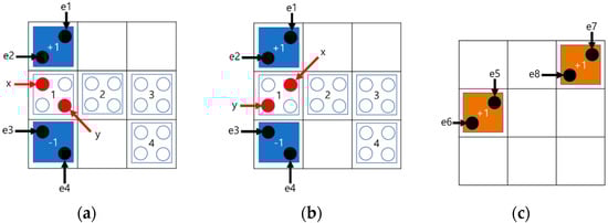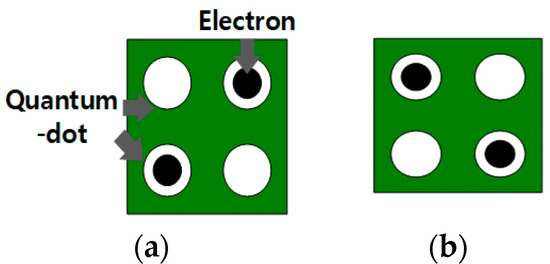 QCA uses a quantum cell as a basic element and forms a circuit by arranging adjacent quantum cells. Each quantum cell has four quantum dots that can accommodate electrons, and each cell has two electrons arranged, such that the distance between them is long owing to the Coulomb repulsion, which is a repulsive force between electrons, which are arranged diagonally. The quantum cell has two different polarizations states, which are +1 and −1 polarization as shown in Figure 1a,b, respectively, and can be mapped to 1 and 0 in binary logic. When the polarization of a specific cell is determined in the QCA circuit, the polarization of adjacent cells is also determined by Coulomb repulsion, and thus a signal is transmitted [6,7].
