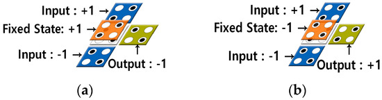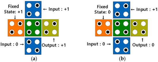 In the QCA environment, OR and AND operations can be implemented using majority gates. The majority gate receives three input values and has one output. Figure 2 shows an OR gate and an AND gate implemented using a majority gate that receives three inputs. As shown in Figure 2a,b, a 2-input OR gate or a 2-input AND gate can be implemented by fixing one input to 1 or 0, respectively [8,9,10,11,12,13,14,15].