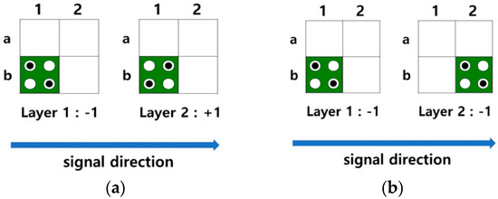 The QCA circuit can be configured using multiple layers. Figure 3 shows a multilayered circuit in which a signal propagates from a quantum cell in the first layer to that in the second layer. As shown in Figure 3a, if the quantum cell of the second layer is located directly above the first layer, the signal is reversed and transmitted from Layer1 to Layer2, and the quantum cells of the two layers have opposite polarizations. On the other side, when the quantum cells of the first and second layers are positioned diagonally, the signal remains as it is and propagates normally, and the quantum cells of Layer1 and Layer2 have the same polarization as shown in Figure 3b. Figure 4a,b show the multi-layered AND/OR gates, respectively.