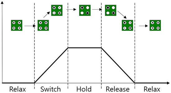 The QCA cell has four clock states as shown in Figure 5. These states are as follows: Switch is a process in which the potential of the cell gradually rises and becomes stronger, Hold is a state where the potential between quantum dots is maintained high and stabilized, Release is a process in which the potential is gradually decreased and weakened, and Relax is a state in which the polarization has disappeared. In QCA, these four states are used as pipeline clocks, and each pipeline clock has a phase delay of 90° from the previous clock [6,7].