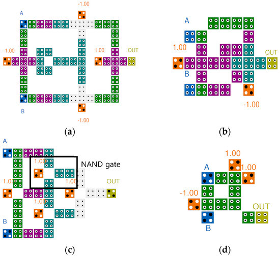 As shown in Equation (9), when the polarization of cell 2 is −1, the potential energy is lower, and thus the polarization of cell 2 is determined to be −1. In the same way, by using physical proof and adding the polarization of the cells determined in the previous step, the polarization of cell 3 can be calculated. The polarization of cell 4 can also be obtained based on the polarization of cell 3. By analyzing the polarization of cells 1, 2, 3, and 4 determined by using physical proof, cell 1 has the result of an OR operation of A and B, and cells 2, 3, and 4 have the result of an XNOR operation of A and B.