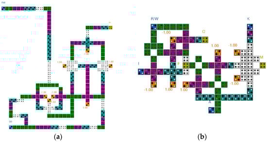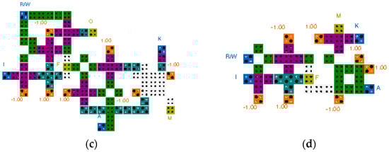Equation (2) is a formula for calculating the potential energy owing to the interaction between electrons. is the potential energy, k is Coulomb’s constant, q1 and q2 are the sizes of the electric charges of each electron, and r is the distance between the two electrons. At this time, k, q1, and q2 are constants, calculating the numerator of Equation (2) as given in Equation (3). In addition, the potential energy of the electron configuration of the cell is expressed as the sum () of the potential energies of the two electrons in the cell as in Equation (4) [48]:
