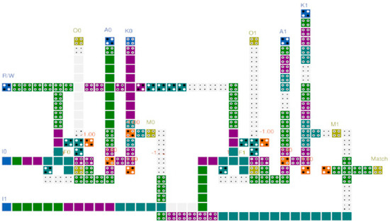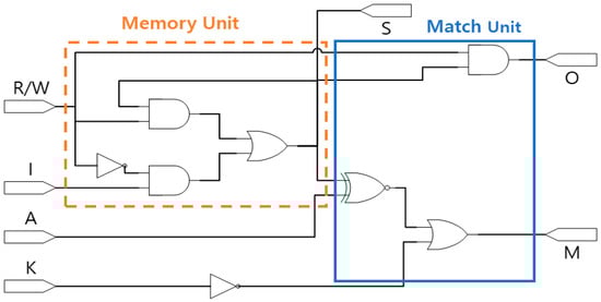 Figure 10 shows the logic diagram of the CAM cell used in this study. The circuit that determines the output value M in the match unit of Figure 7 is arranged as in Equation (1) and can be designed using a 2-input XNOR and a 2-input OR gate.
