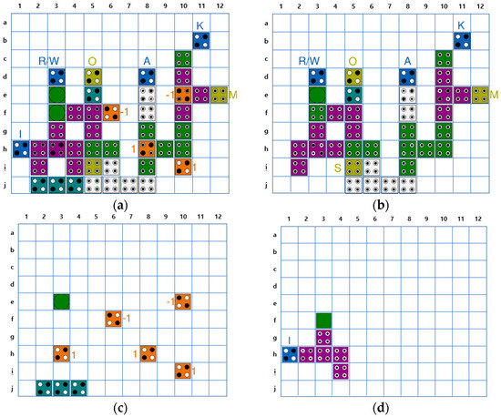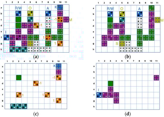 Figure 11 shows each layer of the QCA CAM cell separately based on the logic diagram of Figure 10. The position of the cells can be identified using the index written on the row and column of each figure. The AND/OR gates used in the circuit are multi-layer structures given in Figure 4. The XNOR gate suggested in Figure 9 is used in the match unit. For signal stability, two redundant cells are inserted into Layer2 (b,10) and Layer3 (c,11).