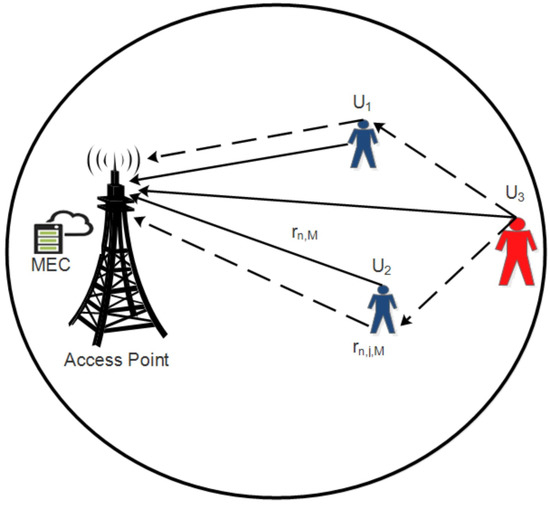 When a node offloads its computation task to the MEC server, the delay consists of three parts: (1) time for transmitting data to the MEC server via the AP, (The link between the MEC server and the AP uses high-speed Ethernet, and the transmission time is neglected.) (2) time for processing the data at the MEC server, and (3) time for transmitting the result from the MEC server back to the node. Here, it is assumed that the size of the result is negligibly small. The time in (1) depends on the transmission rate, which further depends on the distance between the nodes and the AP. As shown in Figure 1, the blue nodes (U1 and U2) are close to the AP, and they can offload their data to the MEC server by direct transmission at a high rate. However, the red node (U3) is far from the AP and near the cell edge. Its direct transmission rate is low, which will cause a large delay. In this paper, we use the relay method to solve this problem and adaptive bandwidth allocation to fine-tune the transmission rate.