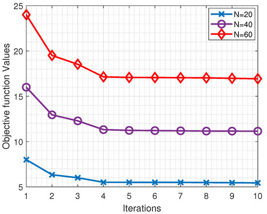 The convergence graph of the proposed algorithm is shown in Figure 3. The results show how the algorithm converged with iterations under different numbers of nodes N, where . Here, we assumed a block fading channel was between the nodes and AP, which means that the transmission rate was constant for the entire period T. We observed that as the number of iterations increased, the algorithm gradually converged to an optimal solution. The converged result of the algorithm increased with the number of nodes N because more nodes led to more computational requirements at the MEC server.
