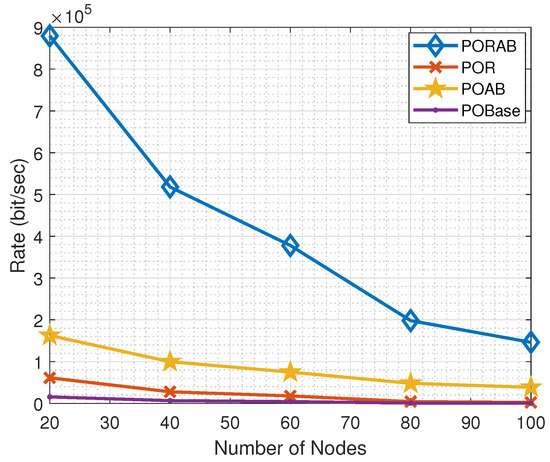 In our model, we optimally allocated the bandwidth, and we can see in Figure 5 that the average data transmission rate improved. For a small number of nodes, the data transmission rate was high. When the number of nodes increased, the data transmission rate decreased, but our proposed PORAB algorithm outperformed POAB.
