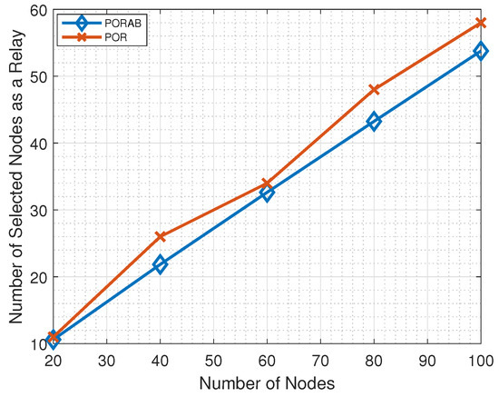 Table 2 shows how the number of selected relays varied with the number of nodes. When , the number of nodes selected as relays was 11 in POR but reduced to 10 in PORAB. Similarly, when , the number of nodes selected as relays was 26 and 22 in POR and PORAB, respectively. We can see from Table 2 that the number of relays increased with the number of nodes.