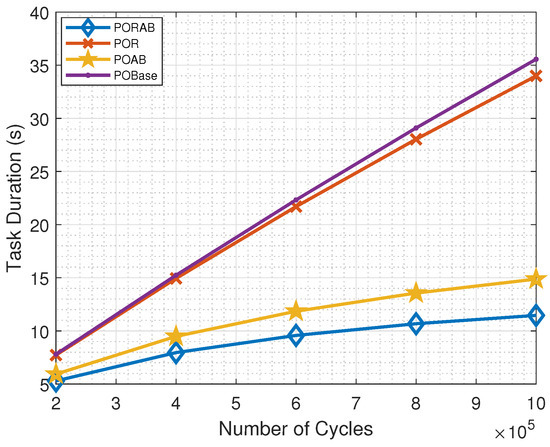 Figure 8 shows that the task computation time increased with the number of cycles required to process each task, but the trend was different. With adaptive bandwidth allocation, the transmission could be made more efficient, and more time could be used for processing at the MEC server. By using relays, PORAB further improved the performance compared with POAB.