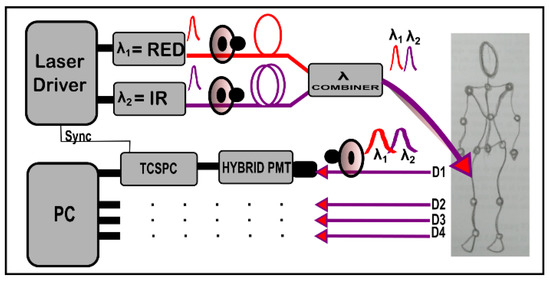 TD NIRS device scheme. λ = wavelength, PMT = Photomultiplier tube, TCSPC = Time-correlated single photon counting, D = Detection channel, Sync = Synchronization signal.