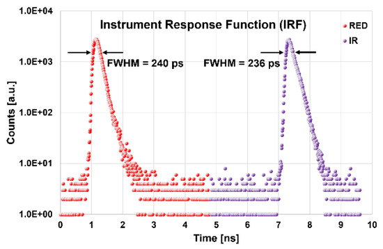 Typical acquisition window during an instrument response function (IRF) measurement. RED = 689 nm, IR = 828 nm, FWHM = Full width at half maximum, semi-logarithmic scale.