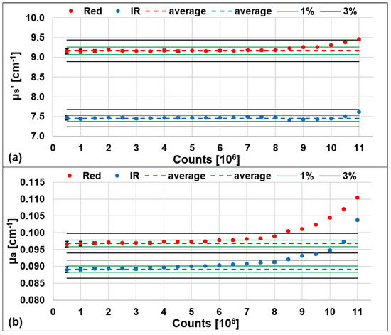 Averaged reduced scattering coefficient (μs′, (a)) and absorption coefficient (μa, (b)) over 10 repetitions and relative error bars, for different count rates. Red: RED wavelength, blue: IR wavelength. The dashed lines are the average μs′ and μa retrieved for counts from 0.5 to 4 × 106. The green and black lines represent the 1% and 3% error regions, respectively.