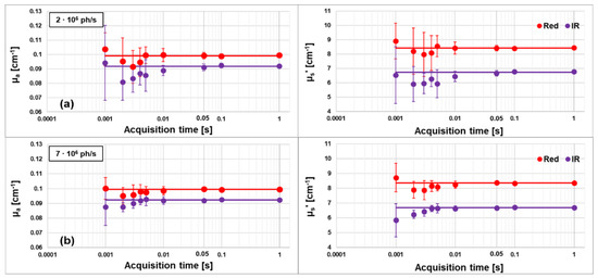 Absorption (μa) and reduced scattering (μs′) coefficients for both wavelengths as function of the acquisition time. Initial count rate set at 2 × 106 counts/s (a) or 7 × 106 counts/s (b). The horizontal lines represent the average value over the acquisitions at 1, 0.1 and 0.05 s.