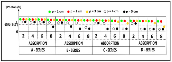 Number of photons/s for the RED wavelength, collected on solid phantoms for different values of absorption (labels 2, 4, 6 and 8: 0.07, 0. 21, 0.35, 0,49 cm−1, respectively) and reduced scattering (series A, B, C and D: 5, 10, 15 and 20 cm−1, respectively) with different source-detector distances ρ (different colors). In the figure, the count rate necessary to obtain a CV < 1% is shown as well.