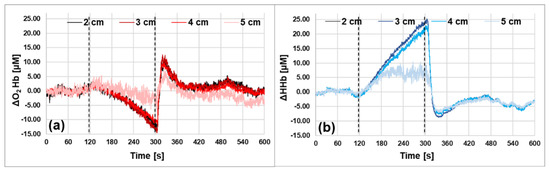 Hemodynamic parameters during an arterial arm occlusion. The dashed vertical lines indicate the start and the end of the occlusion period. The different lines represent the different source-detector distances (from 2 to 5 cm). (a) Oxyhemoglobin (O2Hb). (b) Deoxyhemoglobin (HHb).