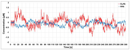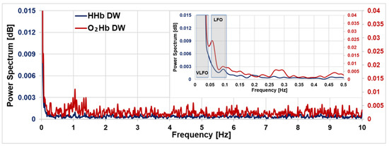Finally, in Figure 9, it is possible to notice a strong frequency component at less than 0.04 Hz, for both hemoglobin species. This range covers the neurogenic activity of the vessel wall and the vascular endothelium function. In a future work, in order to remove the continuous component from the frequency spectrum and thus recover the characteristic peaks in this region, a detrending algorithm has to be applied. Furthermore, other methodologies should be used to obtain sharper peaks, more comparable with the previous literature findings, such as the power spectral density (PSD) estimate via Welch’s method.