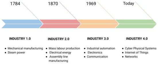 The next and most recent industrial revolution, which is still ongoing, is the Industry 4.0 revolution, which thrives on making machines or devices “smart” [9]. It adds more value to the Industry 3.0 generation by adding communication between the connected devices/machines to minimize human involvement in production. Industry 4.0 is a byproduct of the IoT paradigm and focuses on real-time decision making by the devices based on various external and internal stimuli.
