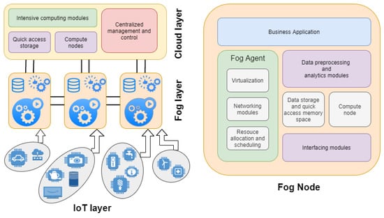The traditional cloud computing paradigm cannot resolve the low latency and faster response needs of time-critical applications, and that is where fog provides a solution to these problems. The fog computing paradigm effectively handles the problem of vast data collection from IoT devices with a low latency and faster response time, and support demands of quality of service [21]. Smart healthcare devices and wearable sensors monitoring patients will need an immediate response in critical situations, and fog can meet these requirements effectively. Fog’s architecture inherently supports agility and flexibility compared to the cloud, which may be packed with much power but does not provide agility, needing computation for sensor networks. Many works have proposed architecture with different perceptions that are most suitable for dealing with various problems specific to certain use cases. However, the fundamental architecture remains the same, with the three-tier architecture consisting of cloud, fog, and IoT layers. Figure 2 describes the architecture advocating programmability, flexibility, and efficient data analytics aspects of fog nodes.