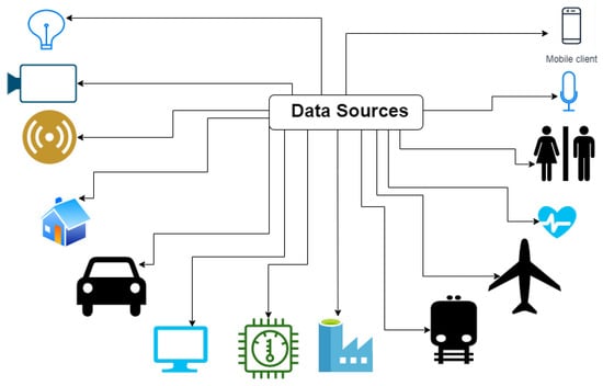 As we can see from Figure 4, typical data sources include mobiles, various types of sensors and actuators including thermostats, engines of airplanes, factories, mobiles, computers, automobiles such as driverless cars, metros, human health data, smart devices such as Google Home, Alexa Echo Dots, smart homes, smart shoes, watches, and, in general, all wearables, etc., and the number of items on the list increases all of the time. The data generated from these sources can be subtly classified into three major types of sources, which are as follows.