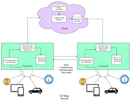 Cloud has more power, while fog has more agility, and agility will beat power when real-time processing and decision making is involved. With great power comes great responsibility, so the cloud has to make computations for all of the devices. In contrast, the fog has to make computations related only to locally connected devices. The devices connected mainly consist of sensors or actuators, which generate huge amounts of data every second. These data are also very raw, contain noise, and need to be pre-processed before some meaning can be derived. For example, it has been shown that a typical driverless car generates several megabytes of data every minute. This is where fog computing might be useful. Fog computing extends the already existing concept known as edge Computing. The edge computing paradigm states that computing and storage are performed directly on the end devices or near them. At the same time, fog computing addresses near computing but is separated from edge devices. The fog computing model is a distributed computing or decentralized model as opposed to the centralized model of the cloud [19]. Every fog node forms a layer of the interconnected network with one another next to the layer of interconnected IoT devices. The role of these fog nodes is not only to process data generated by the devices but also to transmit the decisions to the cloud via other fog nodes so that all of the fog nodes can have a common view of the system as a whole [20].