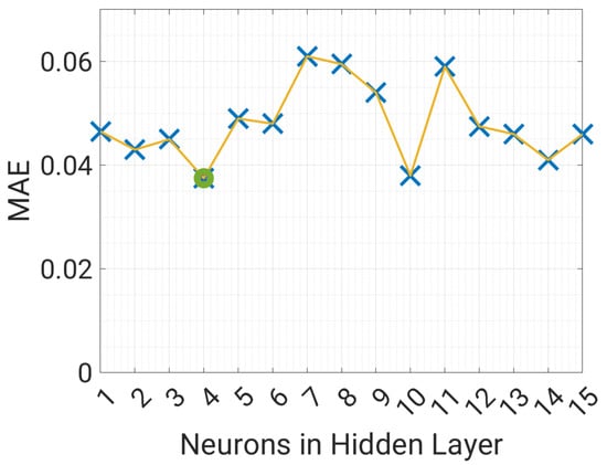 Figure 7. The hidden layer uses sigmoidal neurons and the training function employs the Bayesian regularization algorithm [