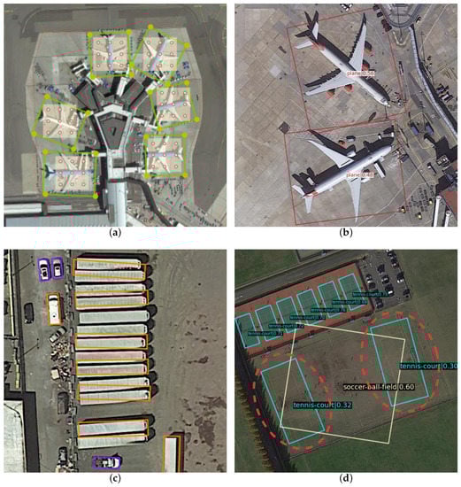 The UCAS-AOD dataset contains objects with different orientations and scales. Table 9 shows that our OA-Det achieves the best performance among the compared methods. Note that Yolov3 [69] and Faster-RCNN [4] are methods based on horizontal bounding boxes, so we add angle prediction to the above two methods. The results show that our OA-Det achieves state-of-the-art performance of 90.29% mAP, outperforming other compared one-stage and two-stage detectors in both categories. The visualization of the dataset is shown in Figure 10.