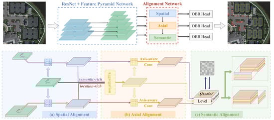 Our method is dedicated to solving feature misalignment problems for small and multi-directional remote-sensing targets and is applied to three dimensions of spatial, axial, and semantic.