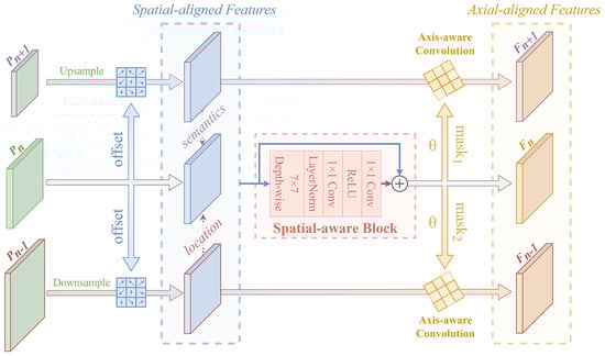 In this section, we first design an intra-level collaborative feature alignment network to deal with the spatial misalignment problem. After that, an axially aware convolution is proposed to alleviate the axial misalignment problem of sampling points. The architecture is shown in Figure 3. First, we take the pyramid feature as the leading feature and perform adaptive spatially aligned resampling of features at adjacent levels; the implementation detail is as follows: