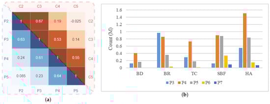 Figure 5. (a) Correlation matrix of different layers. The blue in the lower left corner and the red in the upper right corner are the correlations of the backbone features and pyramid features, respectively. (b) Pyramid-level distribution of different categories predicted by baseline. The colors of the columns represent different pyramid levels, and the categories include baseball diamond (BD), bridge (BR), tennis count (TC), soccer field (SBF), and harbors (HA). - Secondly, feature fusion based on lateral connections is equivalent to a linear combination of the feature hierarchy, which is weak in capturing highly nonlinear features. Thus, it is difficult to cope with remote-sensing targets with various shapes and scales.