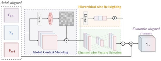 In order to solve the above problems, we propose a hierarchical-wise global context fusion module. As shown in Figure 6, we take the spatially and axially aligned features as input and first perform global contextual semantic modeling for each pyramid level, which can be formulated as: