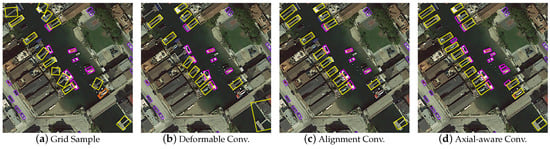 In this section, we verify the effectiveness of the proposed axially aware sampling method based on the multi-scale features extracted by the spatial alignment network. Five mainstream alignment methods are compared to test their axial alignment effects for remote-sensing targets with different orientations. Among them, regular convolution, grid sample, deformable convolution, and axially aware convolution are all sampling methods without additional detection heads. In addition, to compare with the alignment convolution, we designed an additional supervised version for the axially aware convolution, and the experimental results are shown in Table 3.