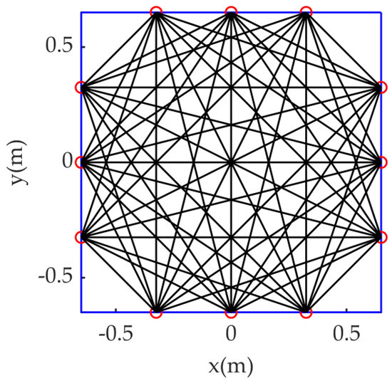 The sample set is used for dictionary learning, dictionary selector construction and algorithm performance testing. The measured area in this paper is a 1.3 m × 1.3 m square, with twelve acoustic transceivers distributed equidistantly around it. Sound waves are transmitted between transceivers to form M = 54 direct sound wave paths that effectively pass through the measured area. Figure 1 shows the direct acoustic path diagram: