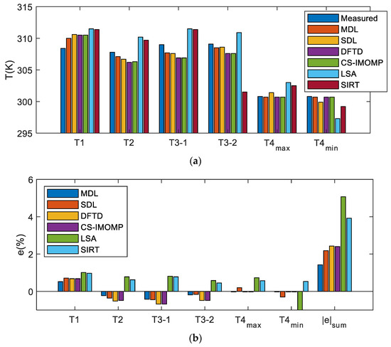 Figure 6 shows the images of T1 ~ T4 reconstructed by the six algorithms. An 80PK-1 thermocouple and digital thermometer Fluke 54 II are additionally employed in this study to obtain the temperature measurement value at the location of the hot spot (i.e., the intersection of the yellow line) on the test level, as a further way to compare the reconstruction results among algorithms. In T1, the thermocouple position is (0,0); in T2, the thermocouple position is (−0.25, 0.25); and in T3, the two thermocouple positions are (−0.25, 0.25) and (0.30, −0.30), respectively, named T3-1 and T3-2. Figure 7 shows the temperature comparisons measured by the thermocouple, with the reconstruction temperature of different algorithms. The error e (%) of the reconstructed temperature relative to the measured temperature is also given in Figure 7b, that is e = [(reconstructed value—measured value)/measured value] × 100%. The hot spot (peak) temperature for the non-uniform temperature field is given in Figure 7a, while for the uniform temperature field T4, the maximum temperature Tmax and minimum temperature Tmin are given in the Figure. The last group of Figure 7b shows , that is the sum of each absolute value of e of each algorithm.