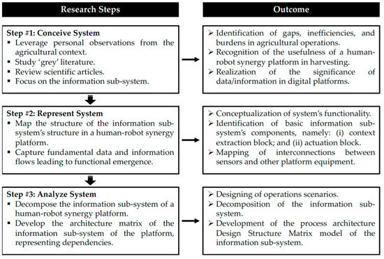 Considering the exposure of supply chains to severe disruptions and the need to use data-driven digital technologies for supply chain security, cost-competitive resilience, and sustainability [19], it is critical to respond to the aforementioned research questions. Responding to Research Query #1, this research conceptualizes a human–robot synergy system for harvesting high-value crops. To address Research Query #2, this study focuses on the ICT sub-system and adopts a system engineering perspective to scrutinize it. In particular, this study applies the Design Structure Matrix (DSM), a technique developed by Steward [20] that provides a chaste and handy matrix format representation of the intra-system interactions of a complex engineering system.