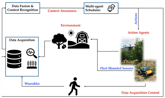 In order to acquire data, sensors are installed at the user and action agents. Specifically, user agents bear wearable devices that perform continuous sensing independently of the agents’ attention and generate raw data. Overall, the data can refer to informed data, structured data, or the actual current context (e.g., the current activity of agents and the state of the surroundings). The human–robot synergy system, which this research explores, does not consider a network of sensory devices installed in the agricultural environment.