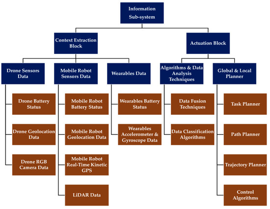This research aims to denote the complexity of the information sub-system of the conceptualized human–robot synergy platform. The overall human–robot synergy system consists of: (i) The physical sub-system and (ii) the information sub-system (Figure 2). This research focuses on the information sub-system, mainly on the data gathering through the platform’s sensors and on its flows and processing to generate information for delivering the system’s function. In this regard, the information sub-system consists of the following:
