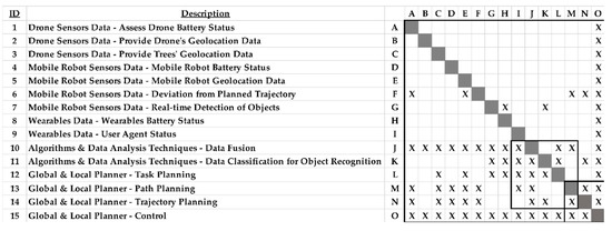 The conceptual development of a human–robot information sub-system to support an integrated human–robot collaborative framework requires full documentation of the underlying process architecture, in particular the interrelations among the sub-system’s processes. To this end, this research applied DSM to map out the data interfaces of the information sub-system [38]. In principle, DSM maps the interactions among a set of N system elements as a square N × N matrix (Figure 3). This matrix represents the identified components comprising the system under investigation. The components’ interfaces are represented as marks in the matrix, which typically reveal patterns (modules or sub-systems) representing the system’s architecture. Specifically, the off-diagonal marks indicate the connections between a system’s elements.