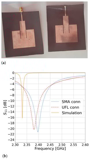 Two versions of the Pyralux-based IRMA were fabricated—one with an SMA connector and another with a U.FL connector—for a comparison of their impedance-matching performance. The fabricated antennas are shown in Figure 2a, and their respective S parameters are in Figure 2b. It is evident that both connectors provide comparable performance. The measured resonant frequency of the SMA-based IRMA was 2397 MHz with a bandwidth of 49.8 MHz and fractional bandwidth (FBW) of 2.08%. The measured resonant frequency of the U.FL-based IRMA was 2381 MHz with a bandwidth of 47.9 MHz and FBW of 2.01%. The latter case is a preferred choice here because of its low profile. The U.FL-based IRMA resonant frequency was 2.82% lower than the design frequency of 2450 MHz, but such a discrepancy is quite common between the results achieved by analytical expressions, which help one make an initial design of the antenna, and the resonant frequency of the manufactured antenna. The simulated resonant frequency is also shown in Figure 2b and is located at 2.33 GHz, which makes just 2.1% difference between the simulated and the measured result for the U.FL-based IRMA. This discrepancy between the simulated and measured curves is practically irrelevant because what ultimately matters is the performance of the fabricated circuit, while the simulation is just an auxiliary tool to reduce the guess work. For example, when the circuit was simulated by another commercial full-wave solver [25], the simulated resonance appeared at 2.44 GHz, which is on the other side of the measured curves (two simulation tools—two different simulation results).