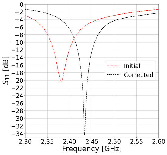 In the next iteration, we designed an IRMA for a resonant frequency that was 2.85% higher (i.e., designed for ) based on the initial result, which should compensate for the slightly lower value of the measured resonant frequency that was obtained in the preceding IRMA model. That compensation consequently resulted in the measured resonant frequency at 2433 MHz, which is very close to the original design frequency at 2450 MHz. Figure 3 shows that the new version of the IRMA exhibits an even better impedance match with −34 dB deep resonance at 2433 MHz. Due to that, the impedance bandwidth was slightly narrower than in the initial IRMA, exhibiting 43.2 MHz of absolute bandwidth or 1.77% of the fractional bandwidth.
