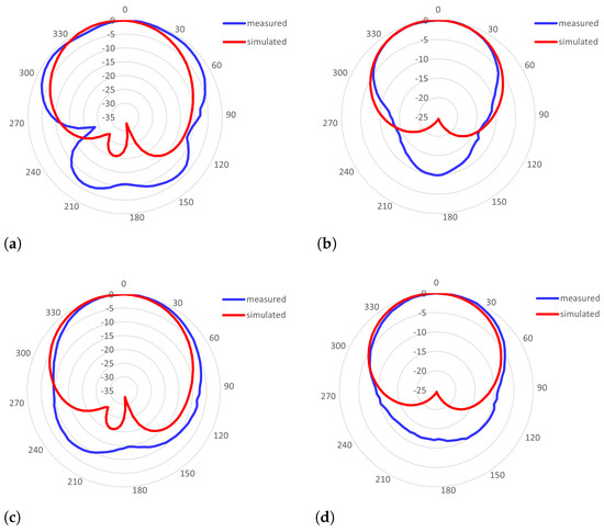 The simulated vs. measured radiation patterns of the Pyralux-based IRMAs with: (a) an SMA connector: E−plane; (b) an SMA connector: H−plane; (c) a U.FL connector: E−plane; and (d) a U.FL connector: H−plane.