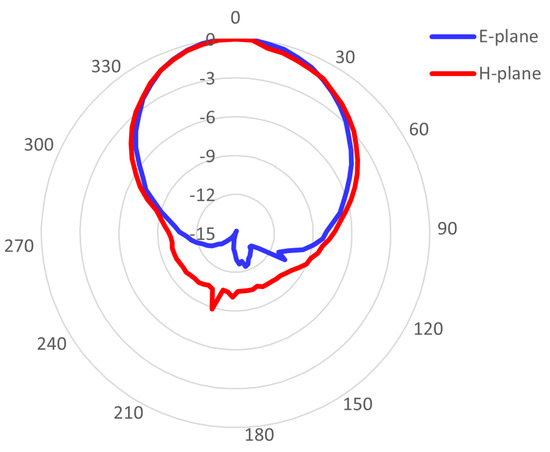 In Figure 5, the measured radiation pattern of the U.FL-based antenna with the corrected resonant frequency is shown. It had and , which are slightly higher values than in the case of the initial U.FL-based antenna due to better impedance matching. The radiation pattern of the frequency-corrected version of the U.FL-based antenna has identical 3-dB beamwidths as the initial U.FL-based IRMA, being 90 wide in the E-plane and 95 wide in the H-plane.