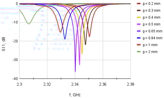 Finding a nearly optimal g was not a straightforward task because: (a) there is no widely adopted formula that helps calculate an optimal g; and (b) the ratio of is quite different in different papers (assuming the results presented there were entirely trustworthy). The results of a sweep analysis, which we undertook using a full-wave simulator [21], are shown in Figure 6 and indicate that there is some optimal ratio of , while higher and lower values of deteriorate the impedance matching.