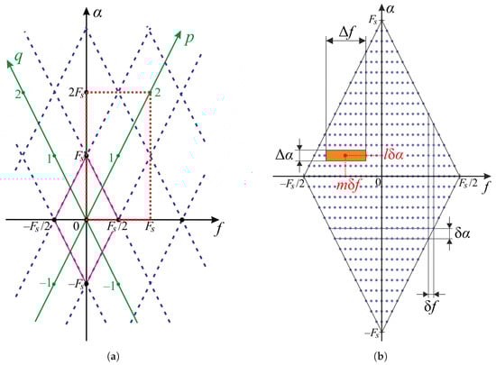As is shown in Figure 1a, the region of support is a diamond, or rhombus, placed at the origin of the bifrequency plane. The main diagonals of the rhombus completely match the axes. They have different lengths. The length of the one along the frequency f axis is the sampling frequency , and the length of the other one, which is along cyclic frequency , turns out to be twice the size: . However, when it comes to processing the discrete-time signal , or time series, SCF has a particular structure beyond the principal rhombus. Thus, SCF turns into a function which is periodic with respect to both its arguments: