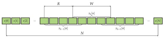 where R is the distance measured in samples between the starting points of two consequent fragments: , as is depicted in Figure 2. This fragmentation can be equivalently described as applying the rectangular window of length moving over the input signal with the step R. After the signal is multiplied by the samples of the window in particular position, only those samples remain non-zero which happen to be covered by the non-zero elements of the window.