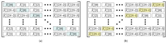 The next step of the 2N-FFT algorithm is building up two square matrices denoted as XR and . They both are of size . The first row of the matrix matches the row vector of the spectrum (17). Then, each matrix row, starting from the second, is obtained via the circular shift in the previous row by one element to the right. The structure of this matrix is shown in Figure 3. The rows of the matrix are calculated in the similar way but with the direction of the circular shifts reversed. It can be noticed that the matrices and have the specific structures known as cirulant and anticirculant matrices [46], respectively.