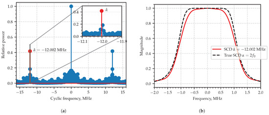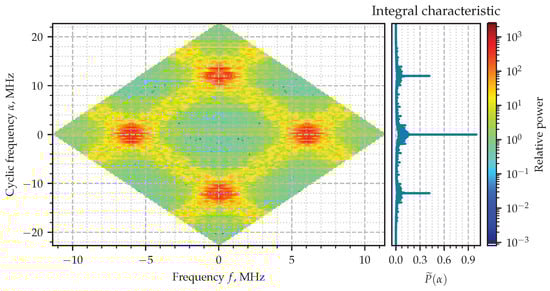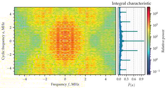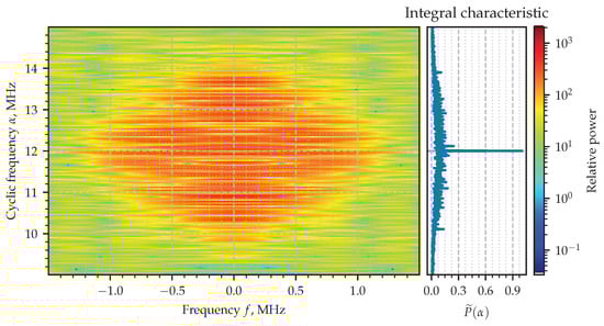 As long as the SCF is a complex-valued two-dimensional function dependent on , a «frequency–cyclic frequency» pair, a possible way to visualize it will be drawing a surface three-dimensional plot or colored diagram, where the color will show the absolute value of the function taken at the point. The cyclic features usually reveal there as thin lines oriented along the dimension of frequency f axis in the SCF plane [47]. Therefore, one may well rely on some criterion to distinguish it from the additive noise [48] or other components of the signal [49], which can produce a significant value at a local points due to the randomness of the estimate. The simple yet quite effective criterion can be based on the pseudo-power accumulated over the whole slice alongside frequency f axis, which was introduced in [50] and further applied in [51]: