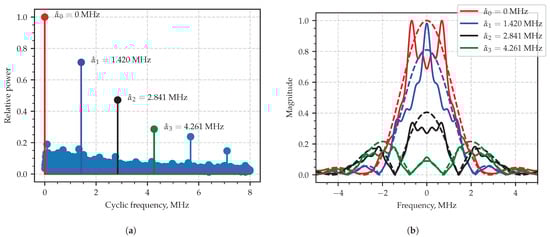 where the summation by m is carried out within the support region of the SCF demarked in (13). If zero cyclic frequency is considered, i.e., , or , this integral characteristic relates to the total power of the process, and power spectral density (PSD) can be thought as the distribution of this power in the frequency f domain. In a similar manner, the scalars concentrated at other cyclic frequencies can be treated as power-like quantities. In contrast, since the cyclic representation (1) does not provide the orthogonal decomposition of the signal itself, there is no sense in the alternative averaging over cyclic frequency dimensions for the fixed frequency f.