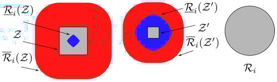 - If the intersection of all is non-empty, then, by virtue of (4), for every there exists at least one pair of intersecting robots; thus, is entirely contained in . Such a compound cell is marked as inadmissible.